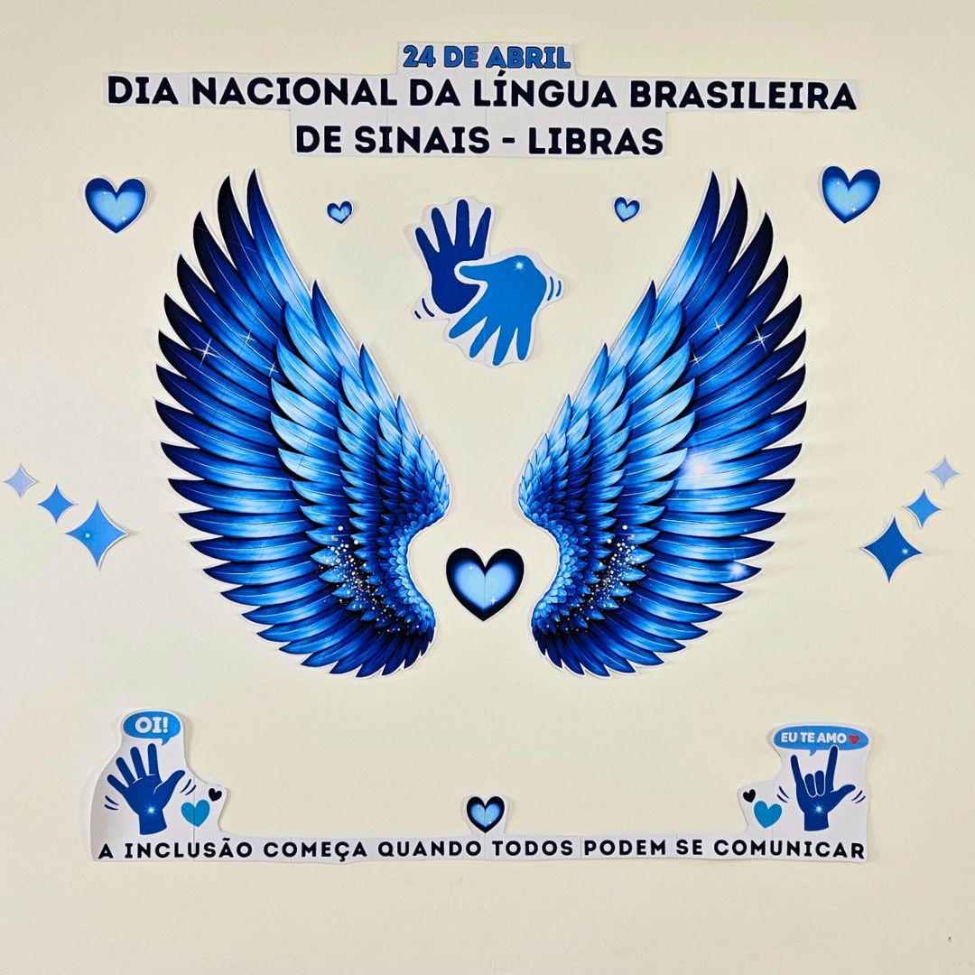 🔸Painel Asas com o tema Dia Nacional da Libras, comemorado em 24 de abril, celebrando inclusão, cultura surda, identidade e respeito.