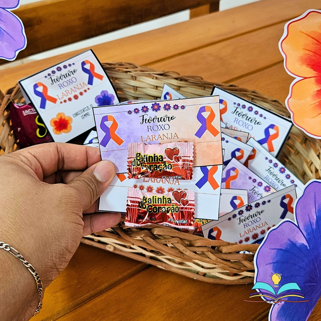 🔸Elementos decorativos para uma cesta com lembrancinhas do tema Fevereiro Roxo e laranja que tem como objetivo conscientizar a população sobre a importância da saúde