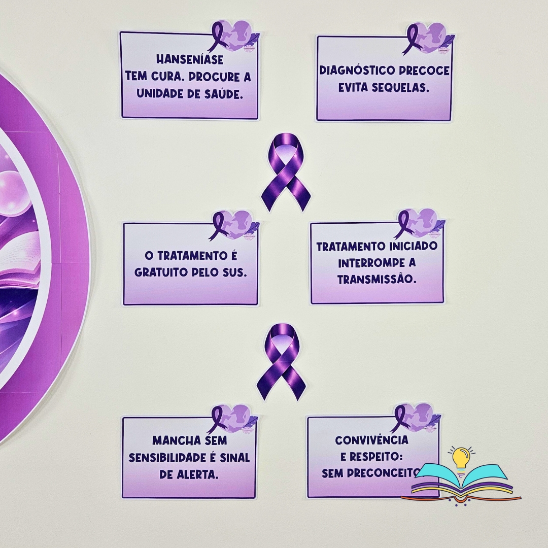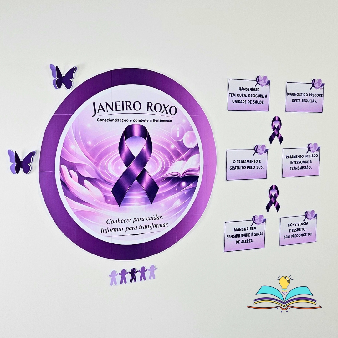 🔸Painel com temática do Janeiro Roxo que é uma campanha de conscientização e combate à Hanseníase, que visa informar a população sobre os sintomas, importância do diagnóstico precoce e tratamento.
