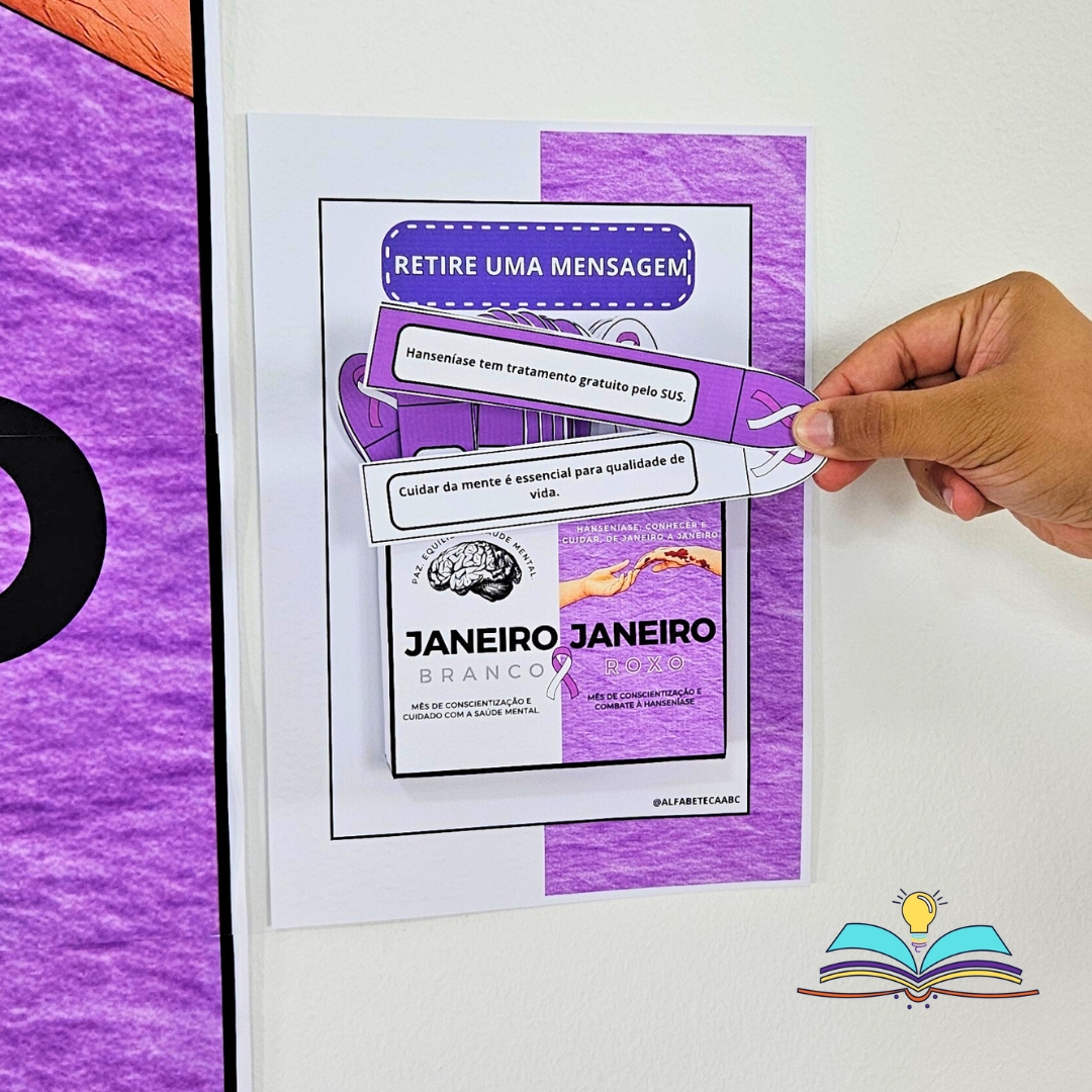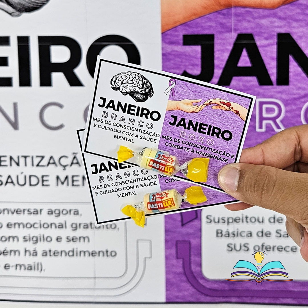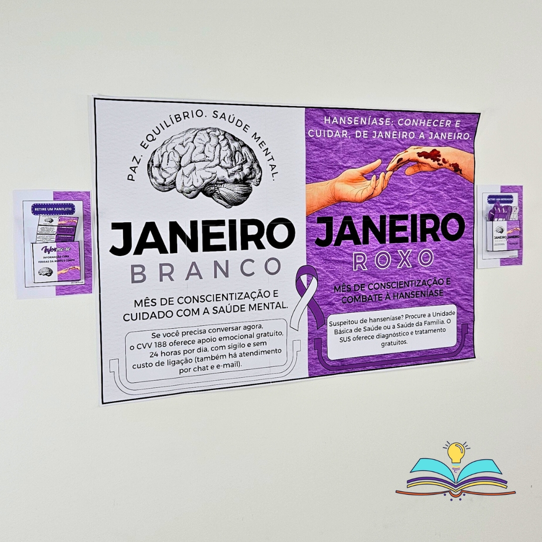 🔸Painel com temática do Janeiro Branco que tem como objetivo conscientizar a população sobre a importância da saúde mental e emocional; e Janeiro Roxo que é uma campanha de conscientização e combate à Hanseníase, que visa informar a população sobre os sintomas, importância do diagnóstico precoce e tratamento.
